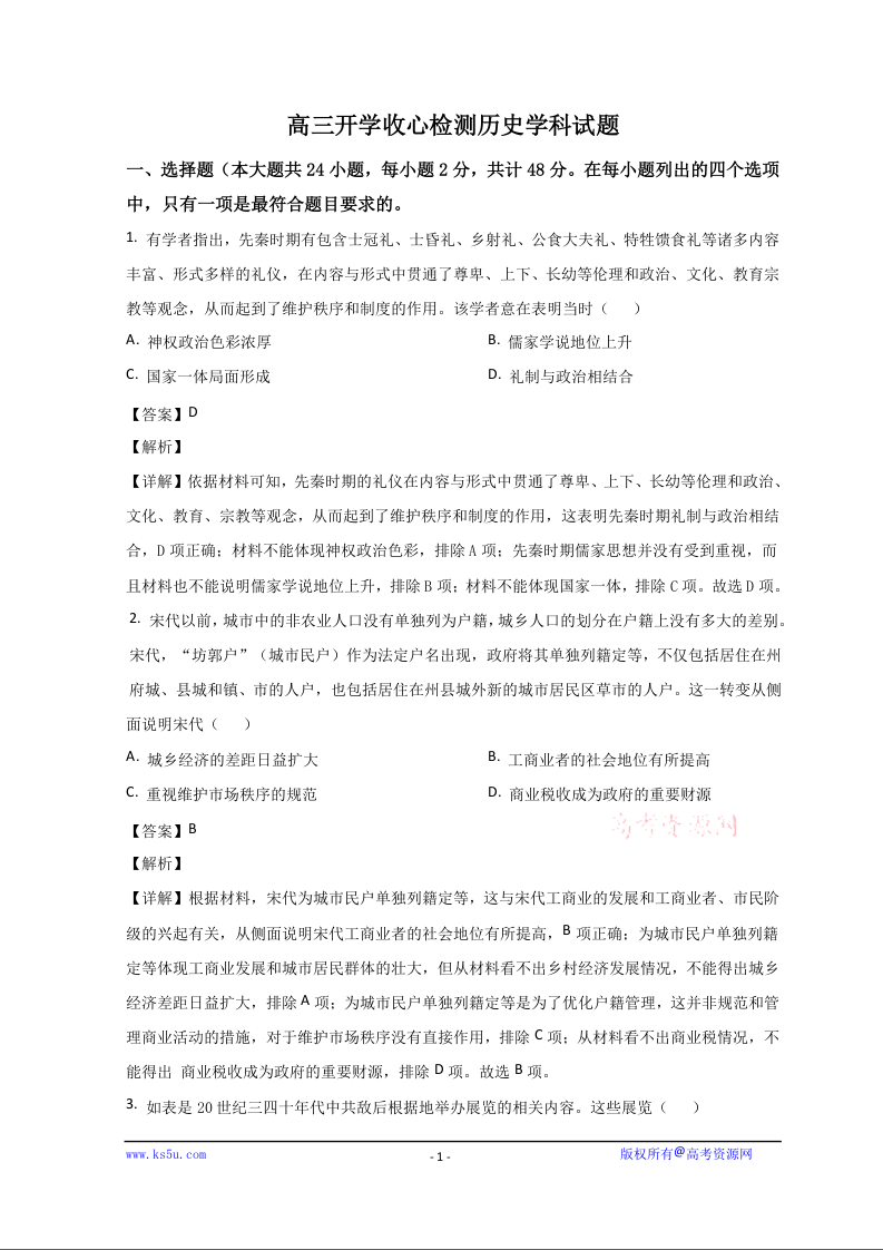 山东省淄博市第五中学2024届高三上学期开学历史(解析版)