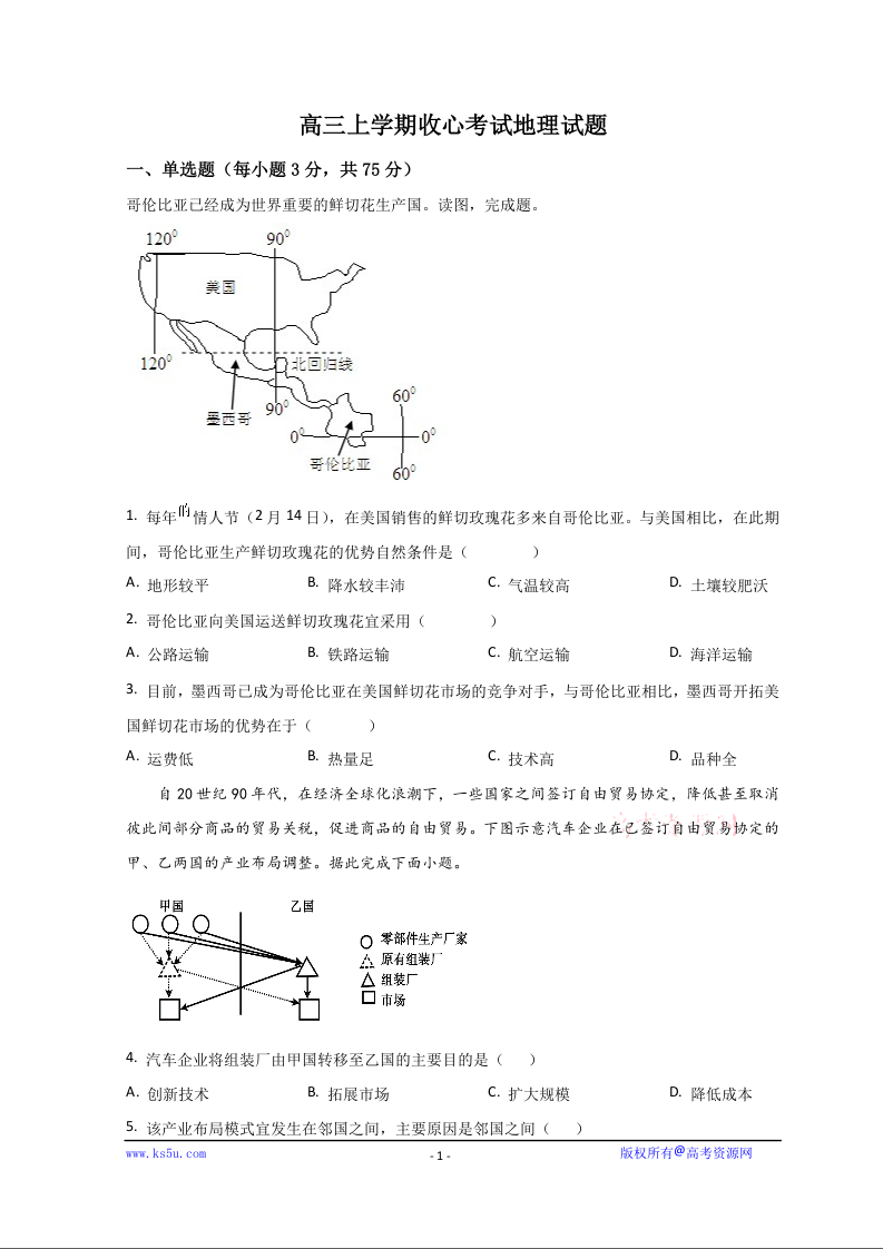山东省淄博市第五中学2024届高三上学期开学地理(原卷版)
