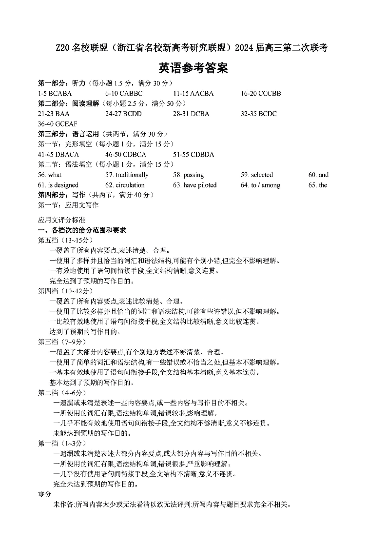 浙江省Z20名校联盟(浙江省名校新高考研究联盟)2023-2024学年高三第二次联考英语答案