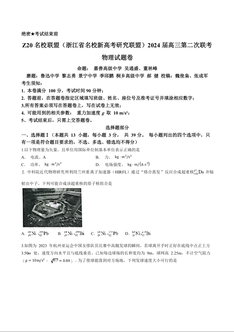 浙江省Z20名校联盟(浙江省名校新高考研究联盟)2023-2024学年高三第二次联考物理+答案