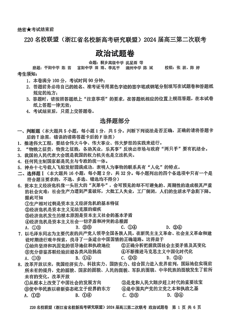 浙江省Z20名校联盟(浙江省名校新高考研究联盟)2023-2024学年高三第二次联考政治