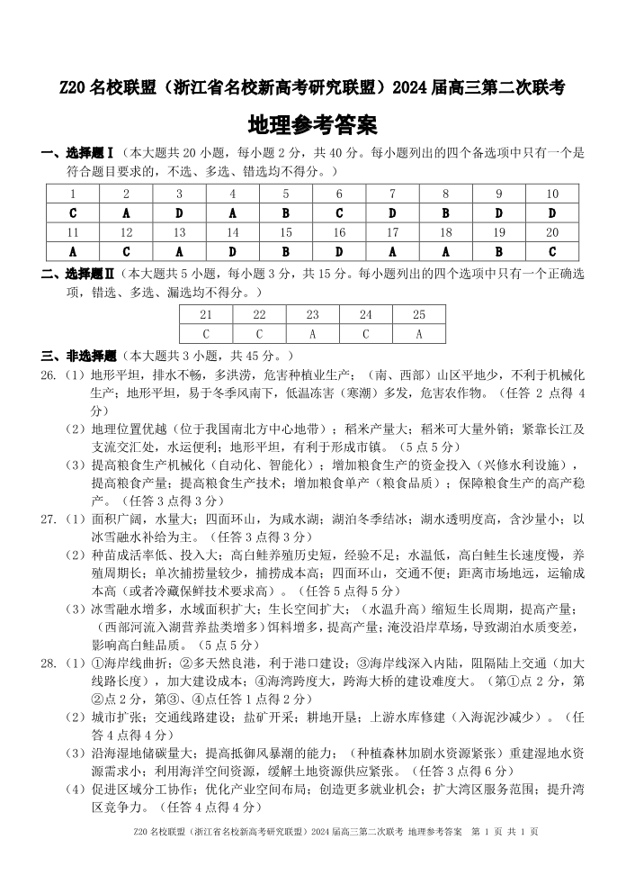 浙江省Z20名校联盟(浙江省名校新高考研究联盟)2023-2024学年高三第二次联考地理答案