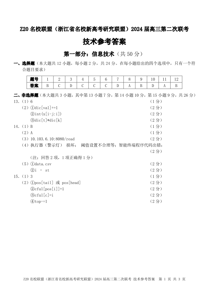 浙江省Z20名校联盟(浙江省名校新高考研究联盟)2023-2024学年高三第二次联考技术答案