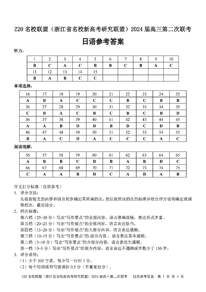 浙江省Z20名校联盟(浙江省名校新高考研究联盟)2023-2024学年高三第二次联考日语答案