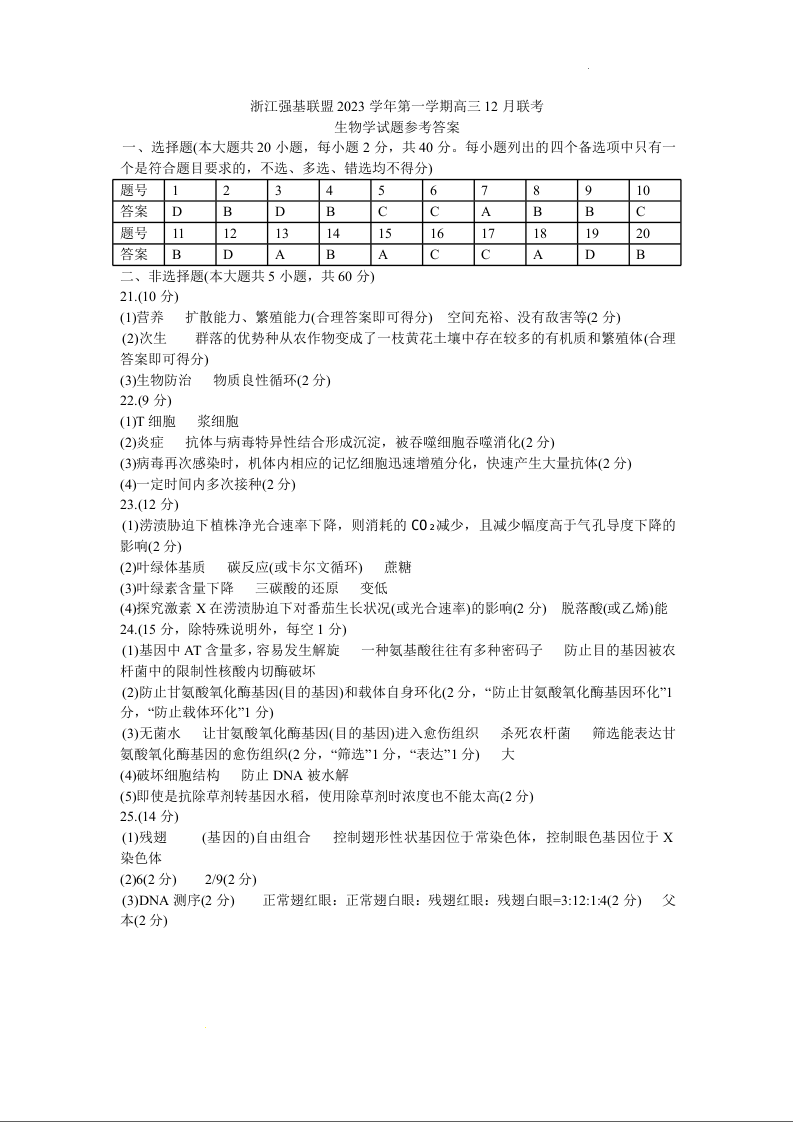 浙江强基联盟2024届第一学期高三12月联考生物答案