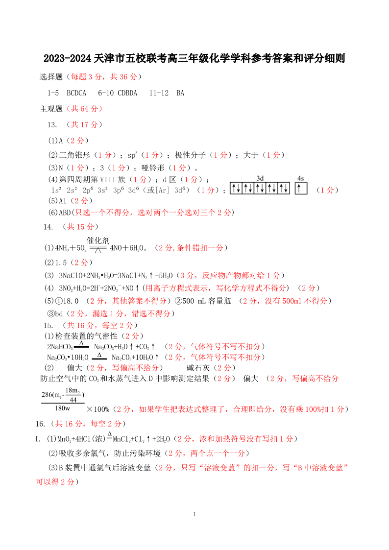 天津市五所重点高中2024届高三上学期12月联考化学答案