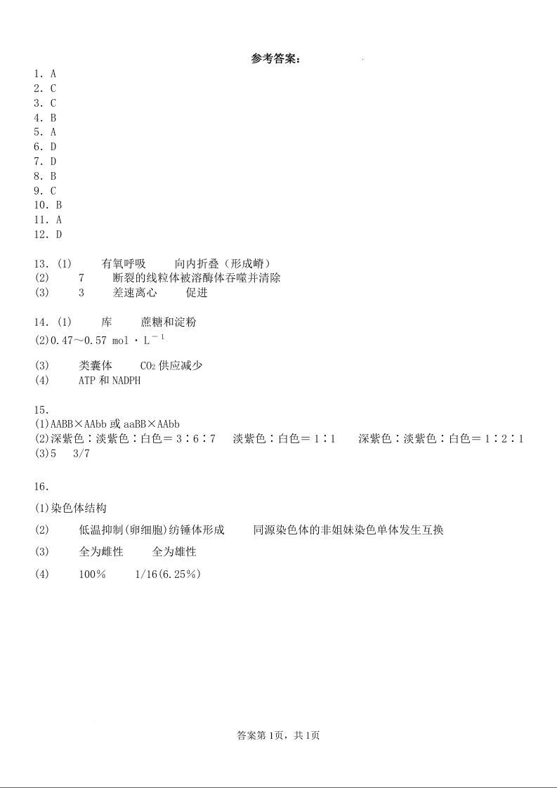 天津市五所重点高中2024届高三上学期12月联考生物答案