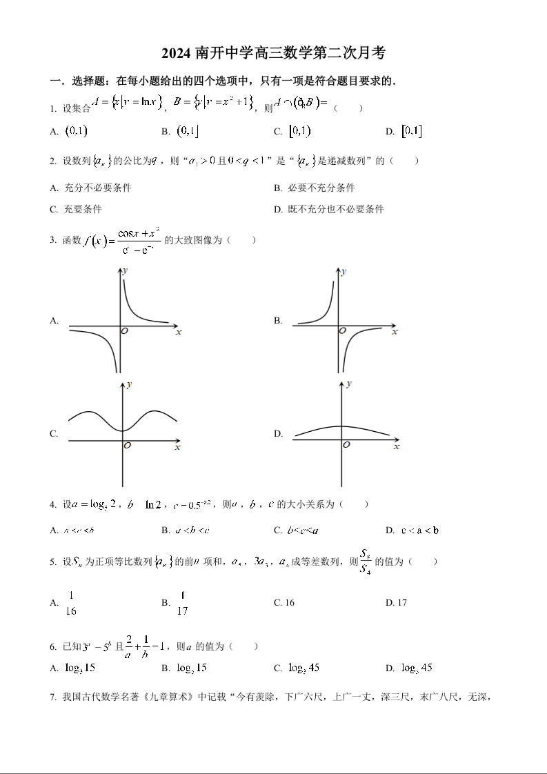 天津市南开中学2024届高三上学期12月月考数学+答案