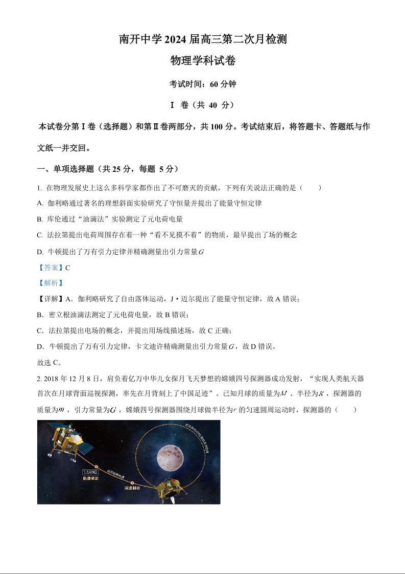 天津市南开中学2024届高三上学期12月月考物理(精品解析版)