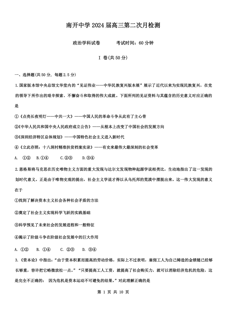 天津市南开中学2024届高三上学期12月月考政治