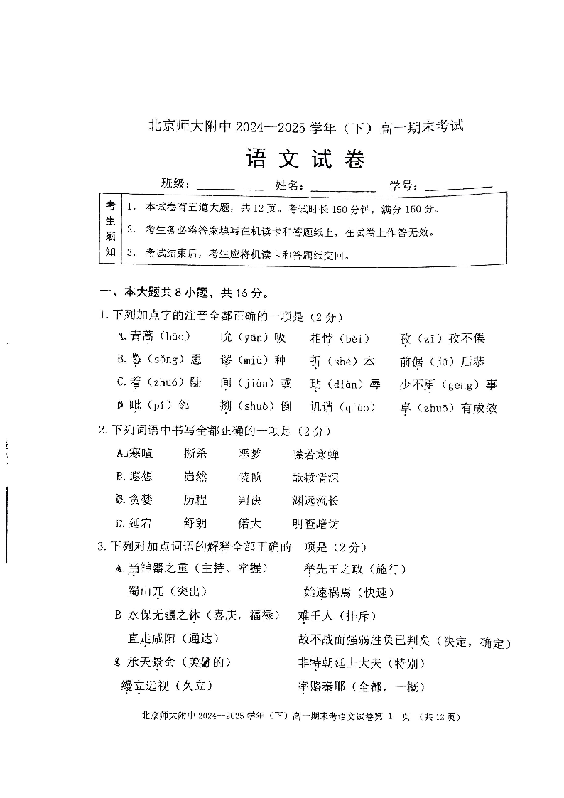 高一语文+答案--北京市北京师范大学附属中学2024-2025学年高一下学期期末