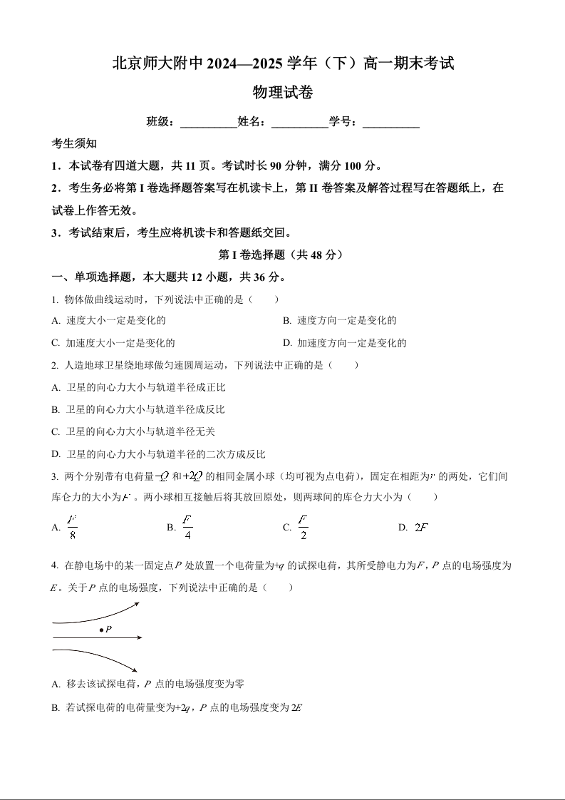 高一物理+答案--北京市北京师范大学附属中学2024-2025学年高一下学期期末