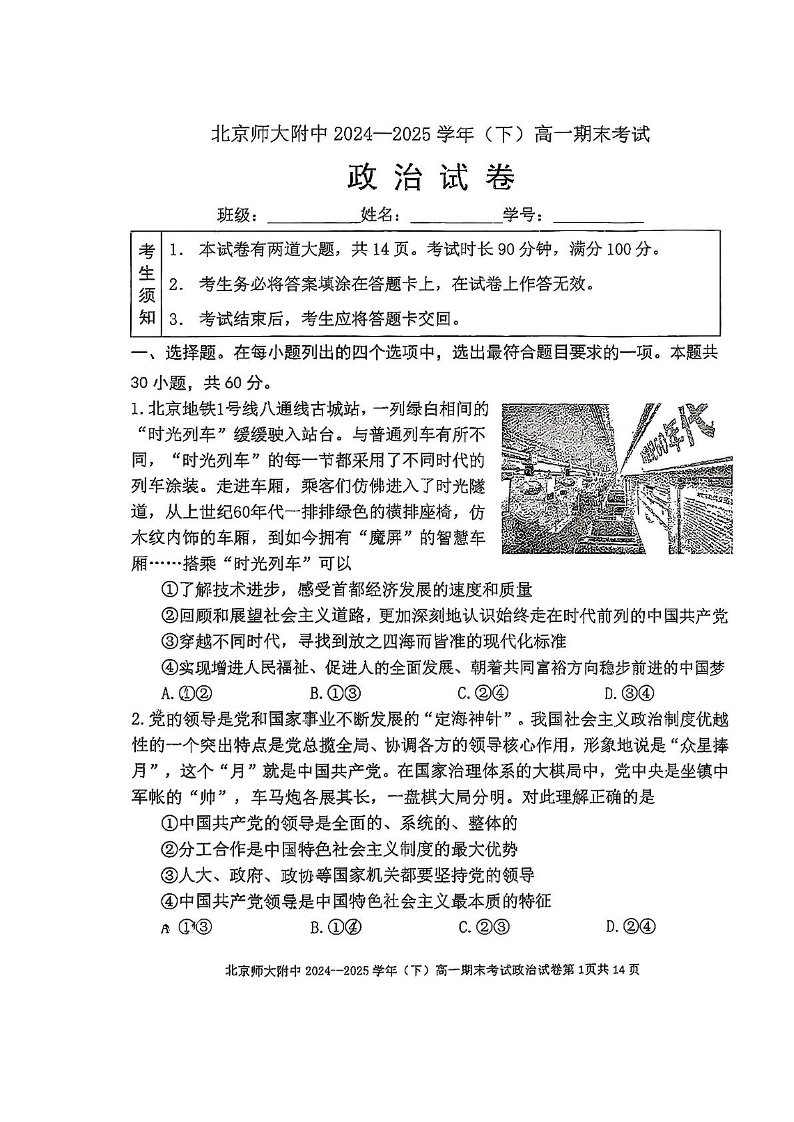 高一政治+答案--北京市北京师范大学附属中学2024-2025学年高一下学期期末