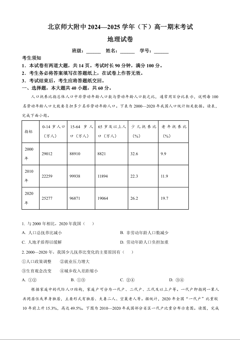 高一地理+答案--北京市北京师范大学附属中学2024-2025学年高一下学期期末