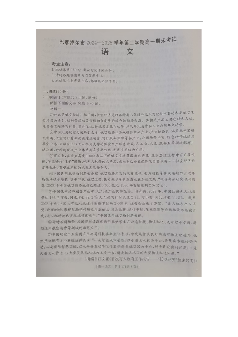 高一语文--内蒙古巴彦淖尔市2024-2025学年高一下学期期末考试