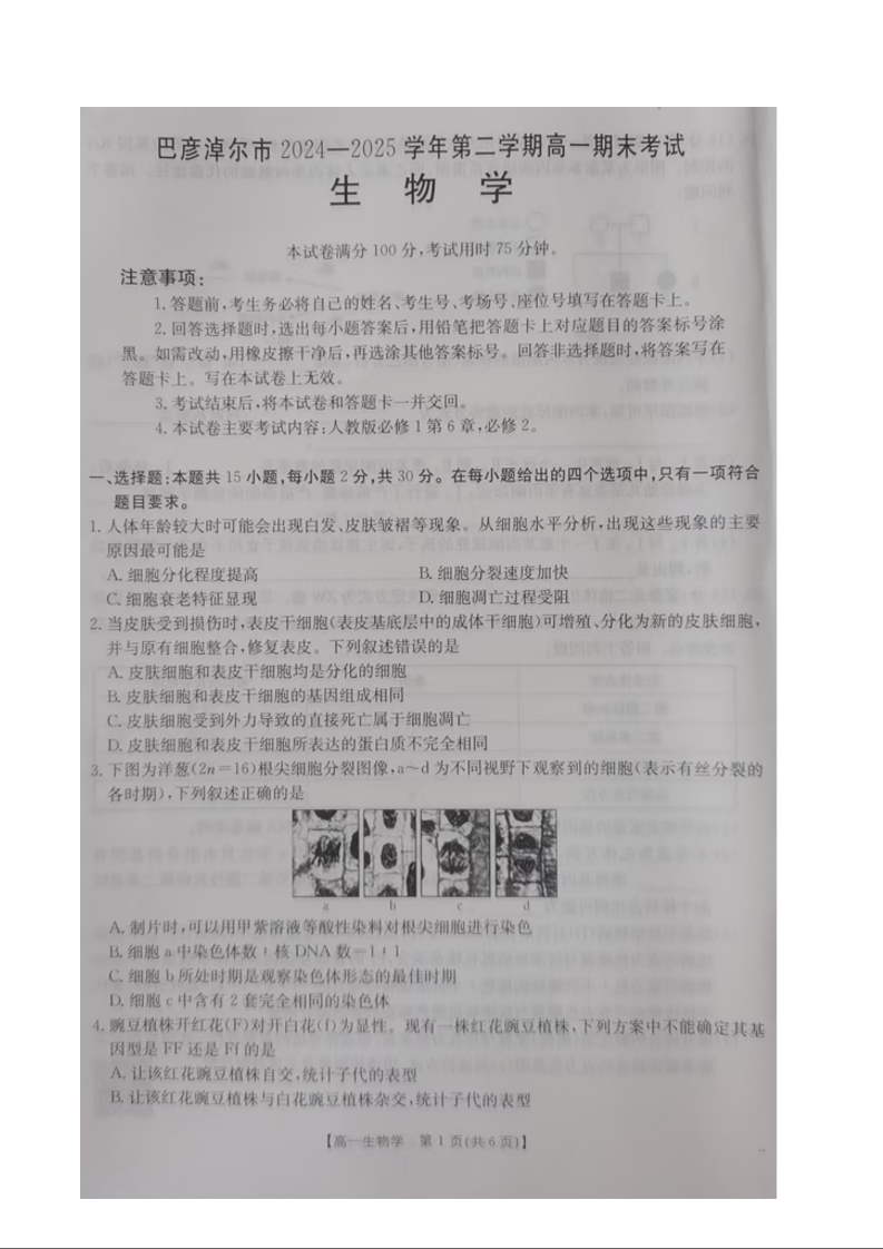 高一生物--内蒙古巴彦淖尔市2024-2025学年高一下学期期末考试