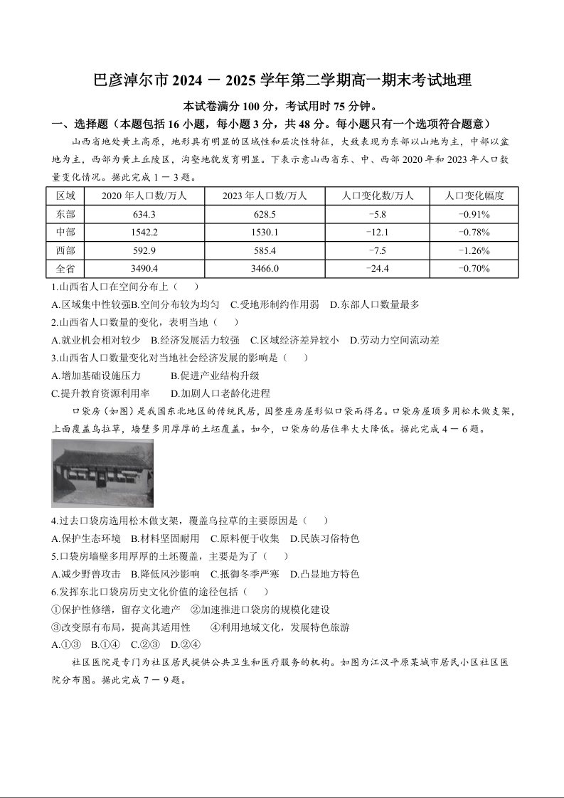 高一地理+答案--内蒙古巴彦淖尔市2024-2025学年高一下学期期末考试