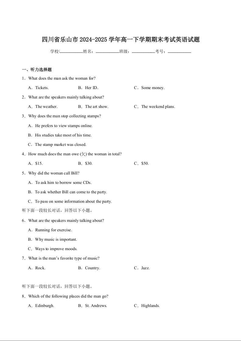 高一英语+答案--四川省乐山市普通高中2024-2025学年高一下学期期末考试