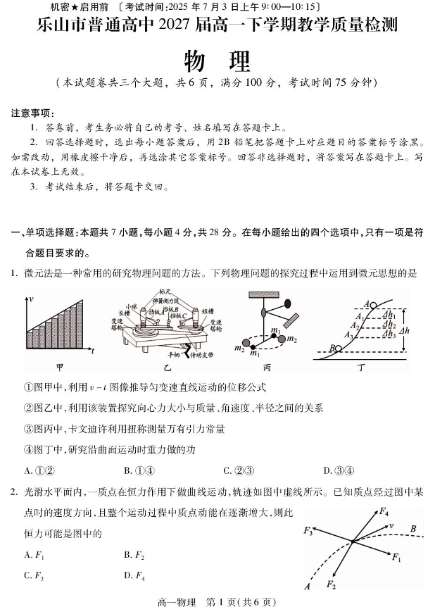 高一物理+答案--四川省乐山市普通高中2024-2025学年高一下学期期末考试
