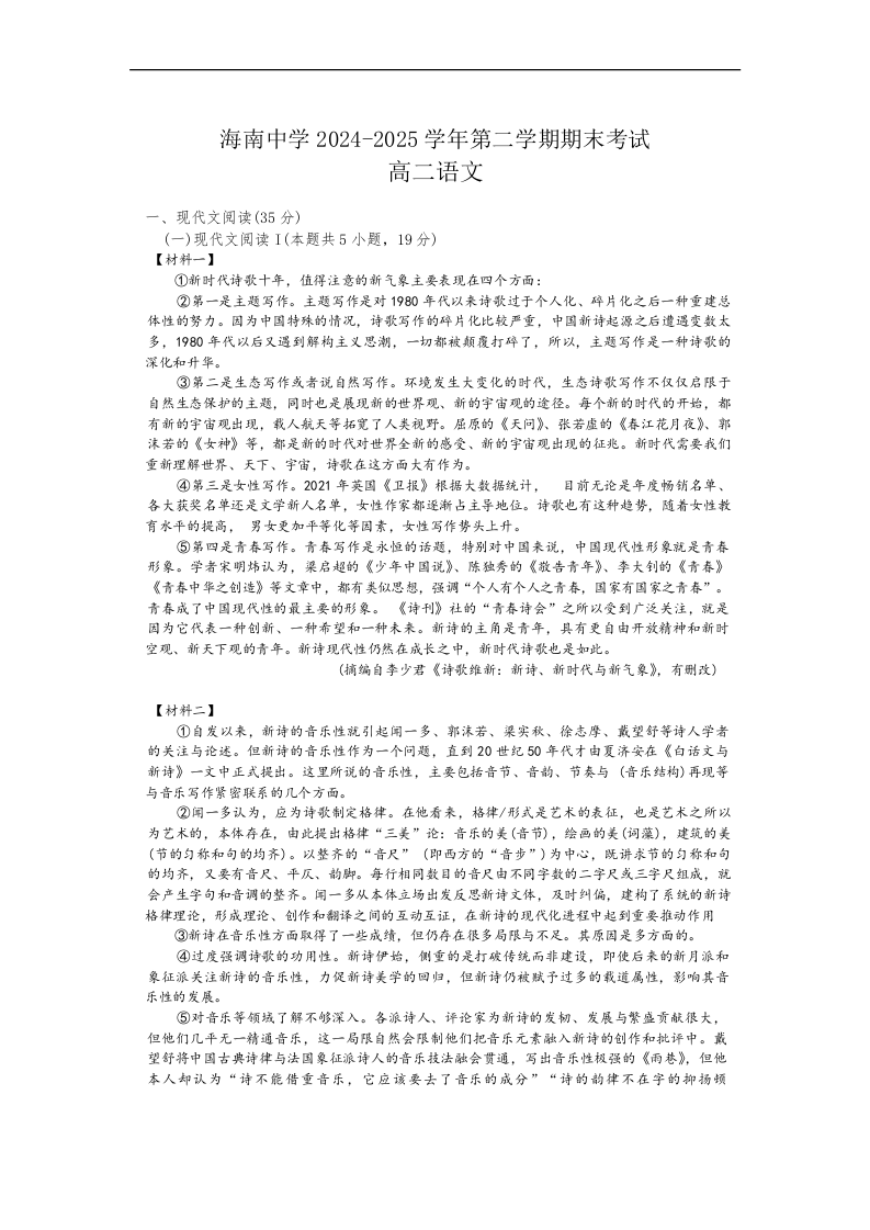 高二语文--海南省海南中学2024-2025学年高二下学期7月期末