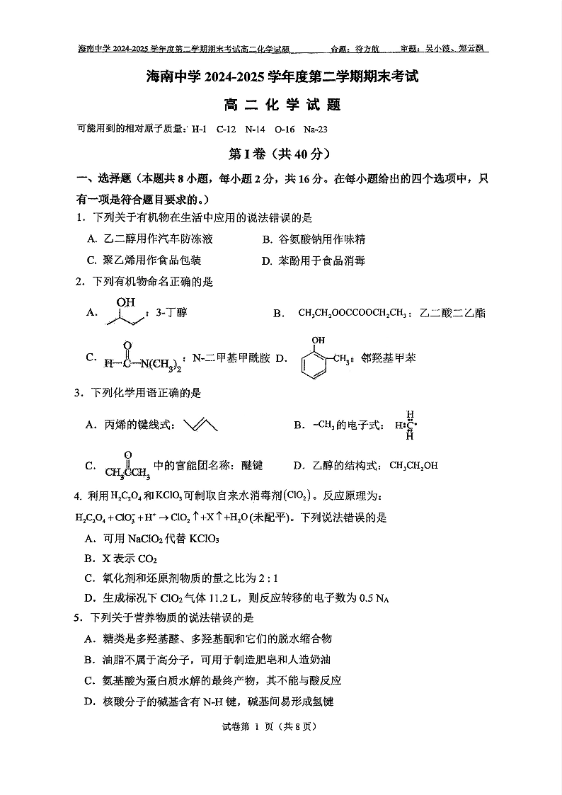 高二化学+答案--海南省海南中学2024-2025学年高二下学期7月期末
