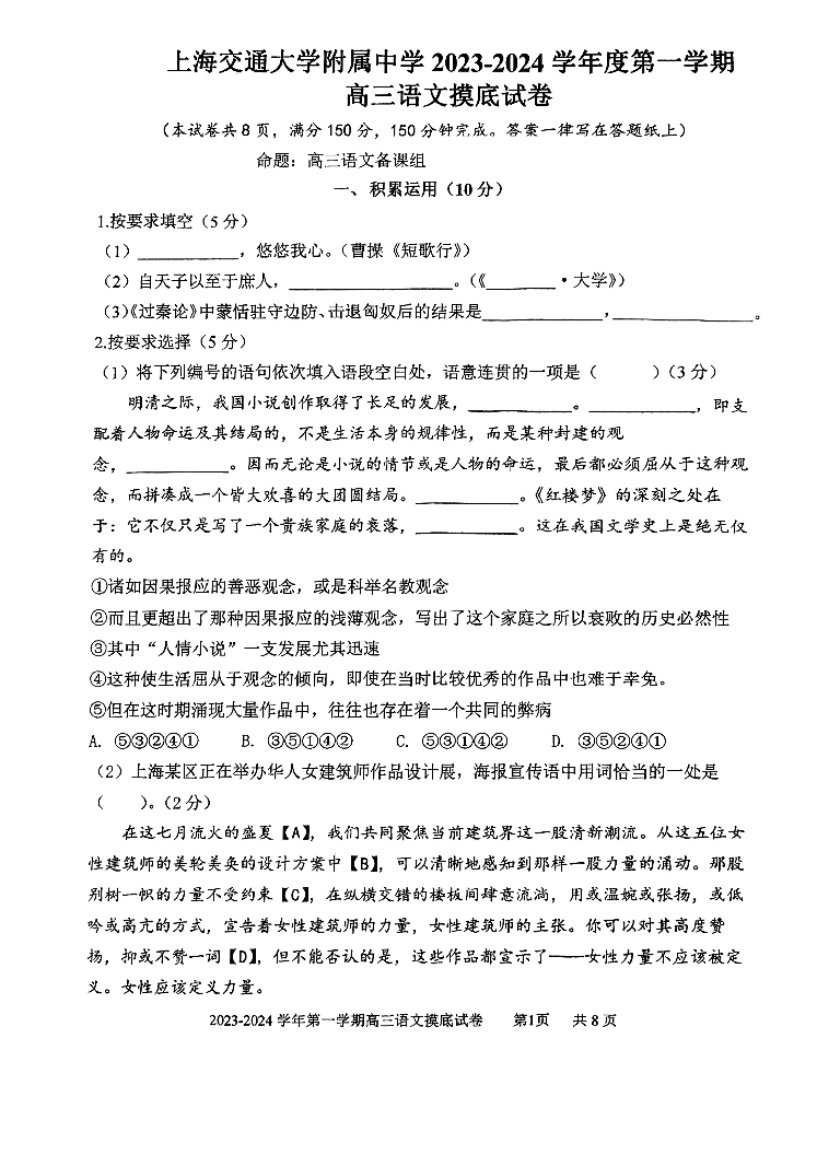 上海市上海交通大学附属中学2024届高三上学期摸底考试语文