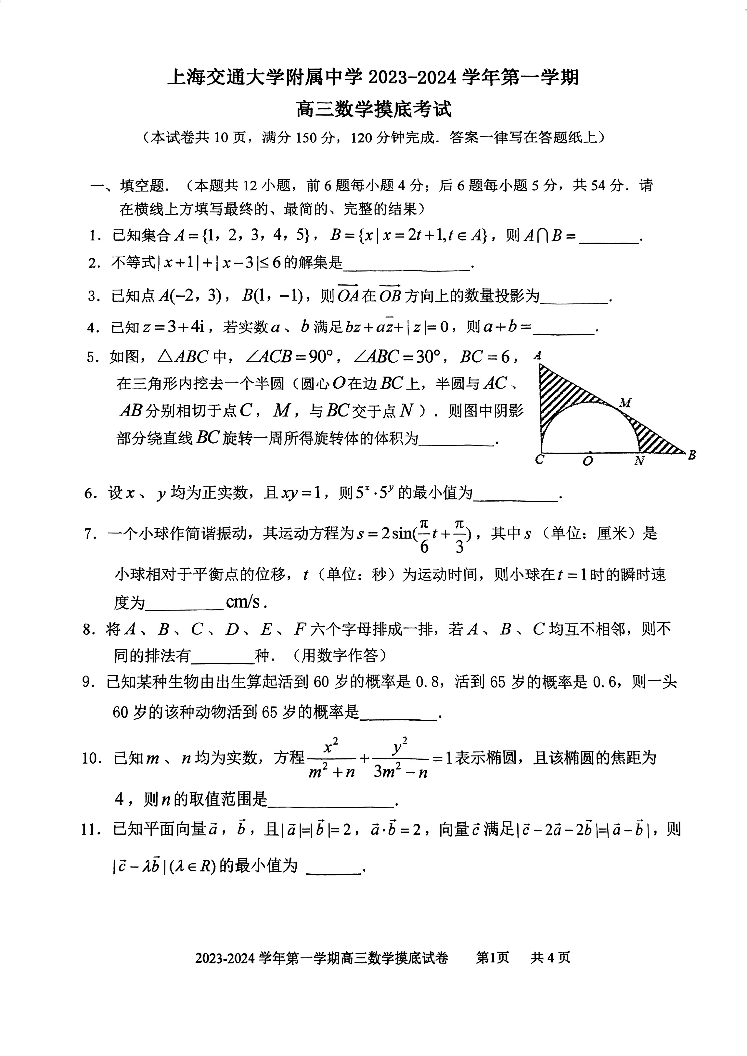 上海市上海交通大学附属中学2024届高三上学期摸底考试数学