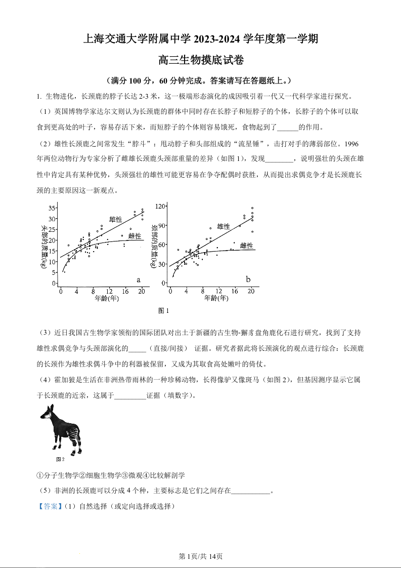 上海市上海交通大学附属中学2024届高三上学期摸底考试生物(精品解析版)