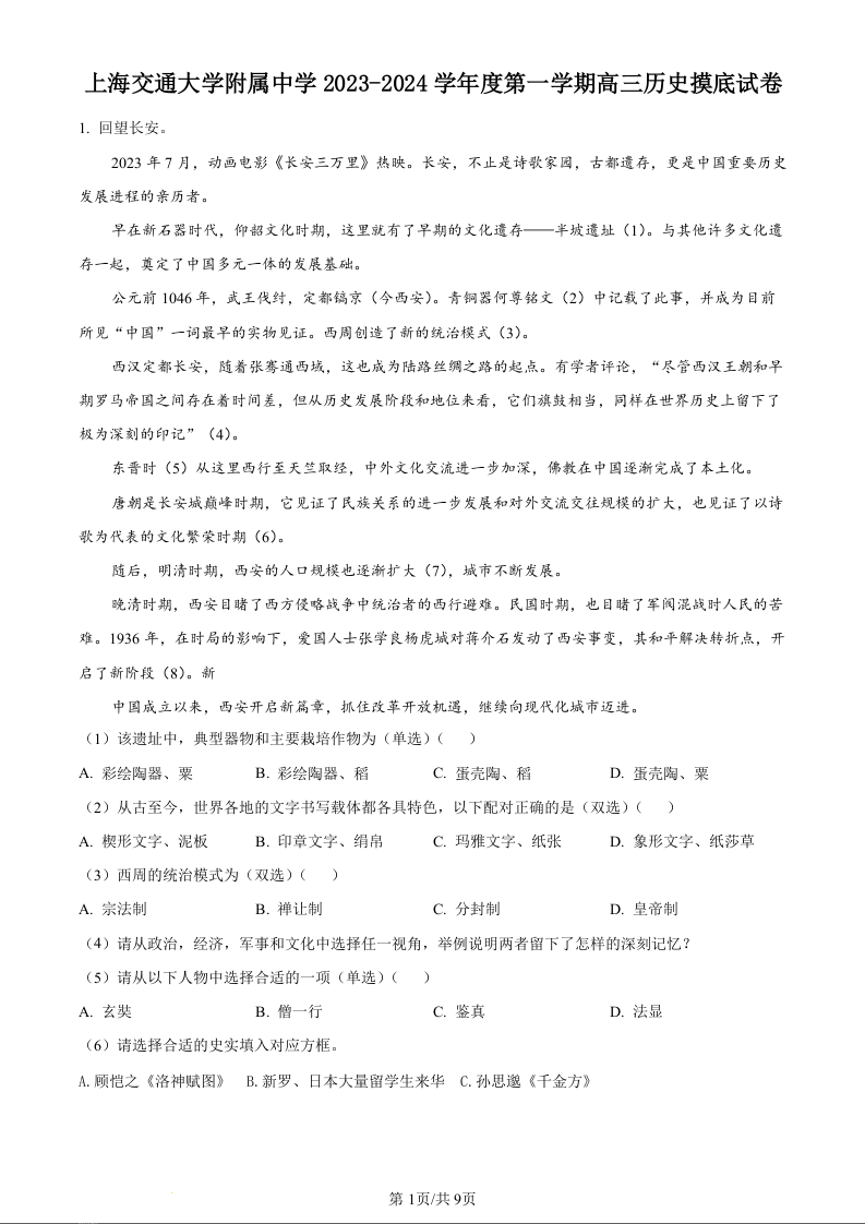 上海市上海交通大学附属中学2024届高三上学期摸底考试历史(精品解析版)