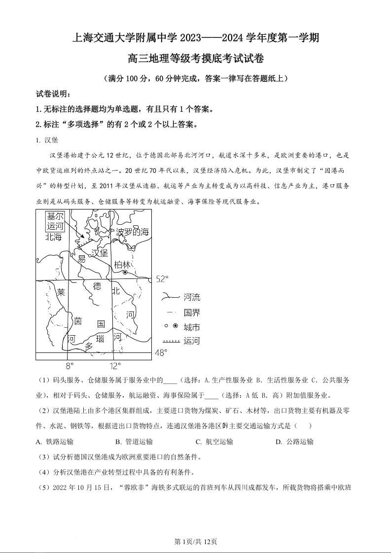 上海市上海交通大学附属中学2024届高三上学期摸底考试地理(精品解析版)