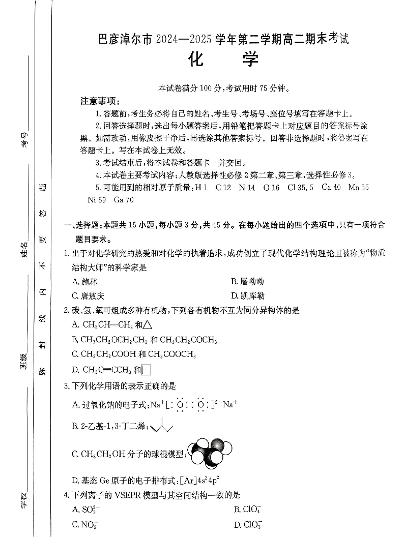 高二化学--内蒙古巴彦淖尔市2024-2025学年高二下学期期末考试