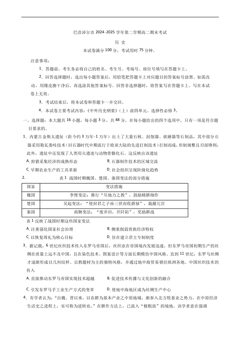 高二历史+答案--内蒙古巴彦淖尔市2024-2025学年高二下学期期末考试