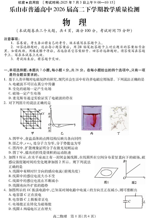 高二物理+答案--四川省乐山市普通高中2024-2025学年高二下学期期末考试