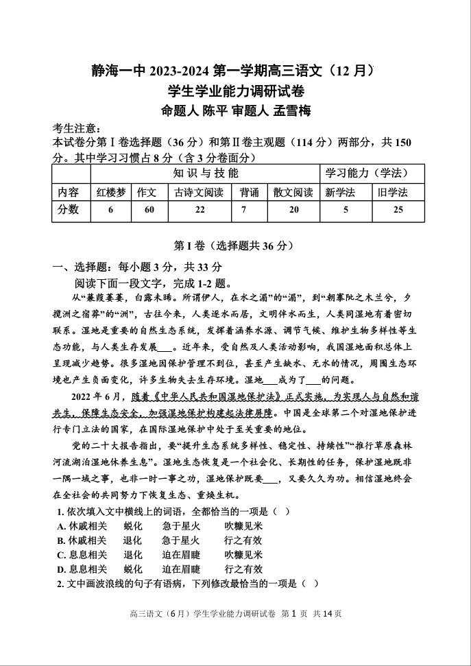 天津市静海区第一中学2024届高三上学期12月月考语文+答案
