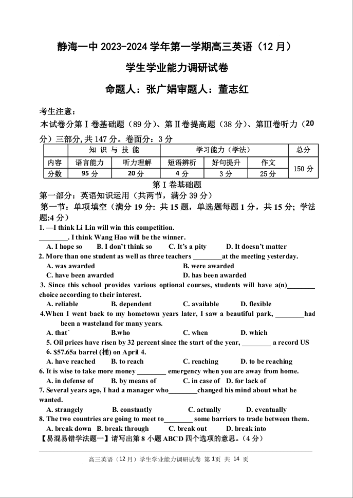 天津市静海区第一中学2024届高三上学期12月月考英语+答案