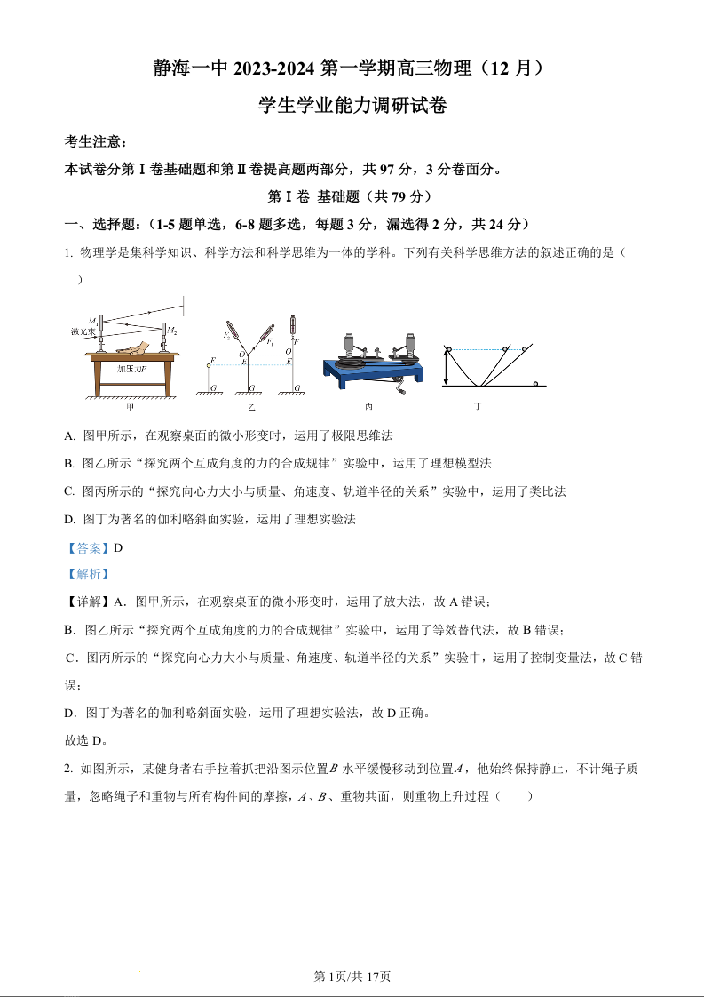 天津市静海区第一中学2024届高三上学期12月月考物理(精品解析版)