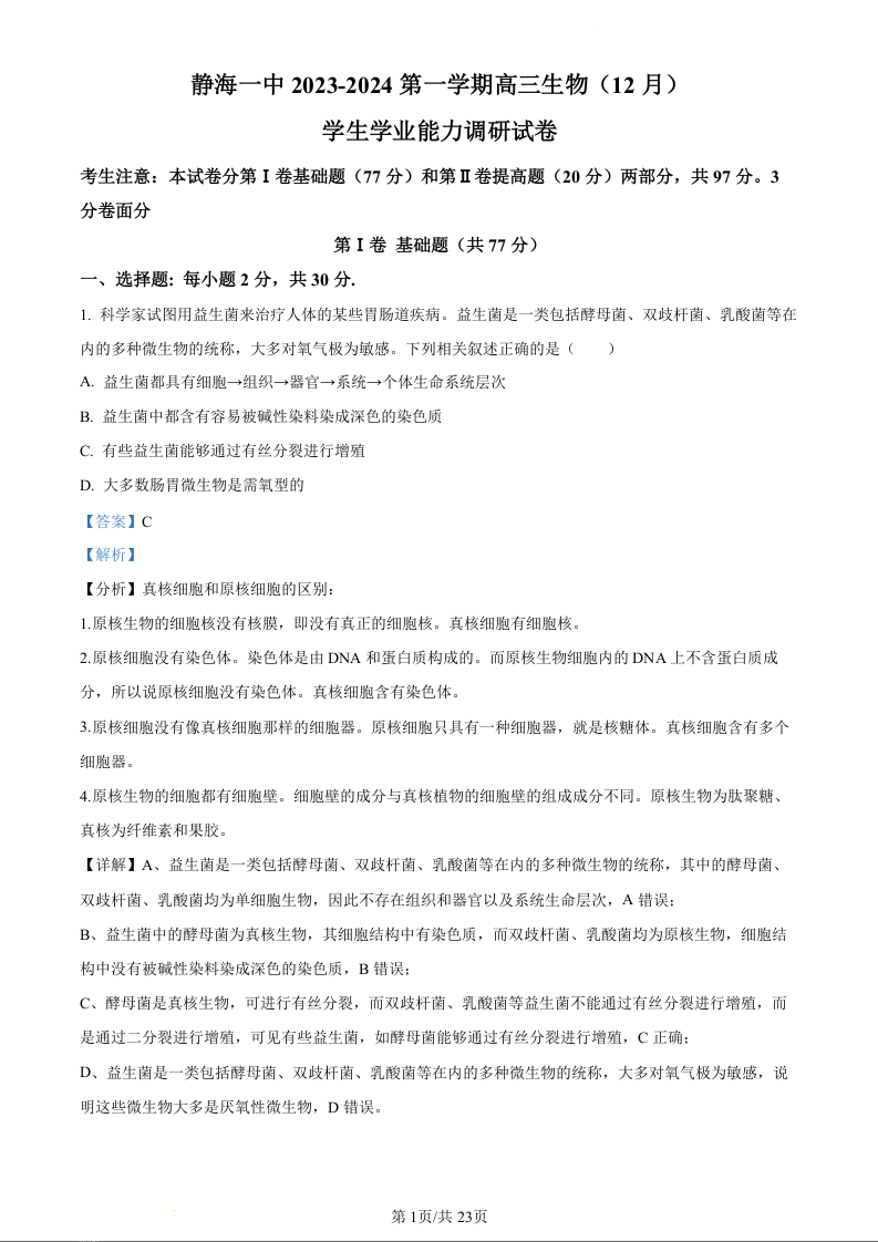 天津市静海区第一中学2024届高三上学期12月月考生物(精品解析版)