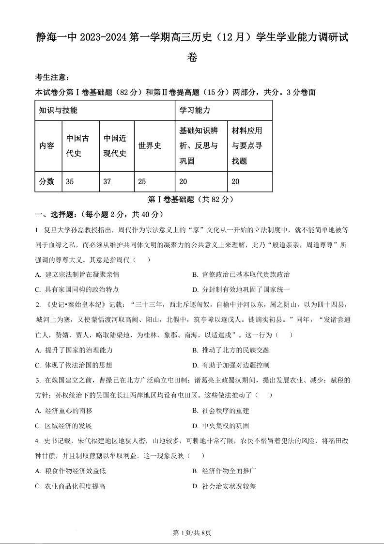 天津市静海区第一中学2024届高三上学期12月月考历史(原卷版)