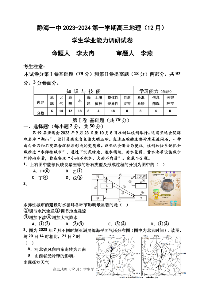天津市静海区第一中学2024届高三上学期12月月考地理+答案