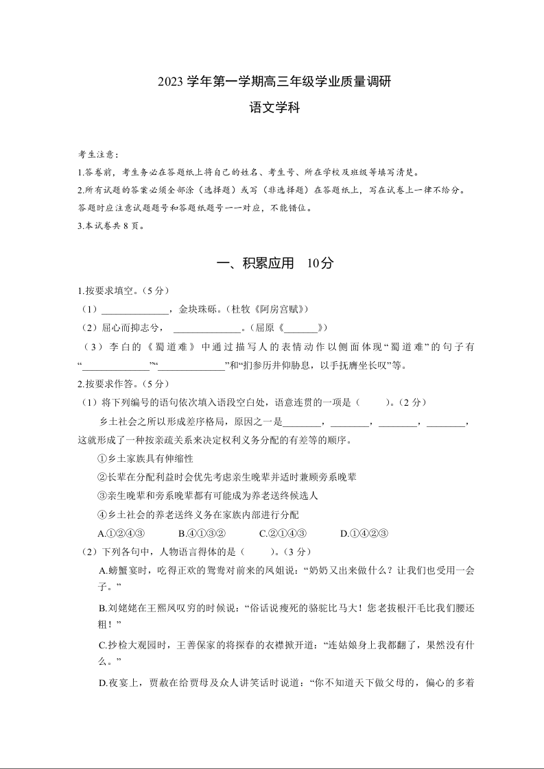 上海市闵行区2024届高三上学期学业质量调研试题(一模)语文+答案