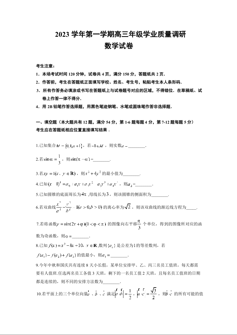 上海市闵行区2024届高三上学期学业质量调研试题(一模)数学+答案