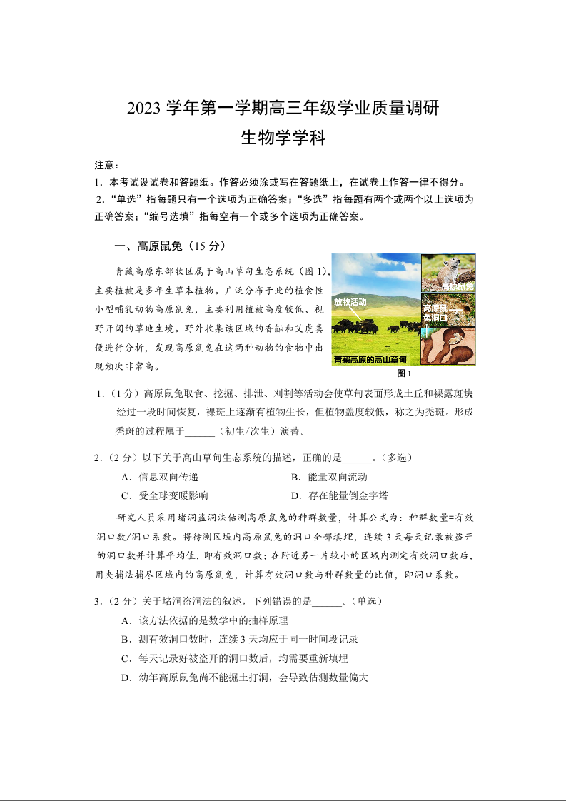 上海市闵行区2024届高三上学期学业质量调研试题(一模)生物+答案