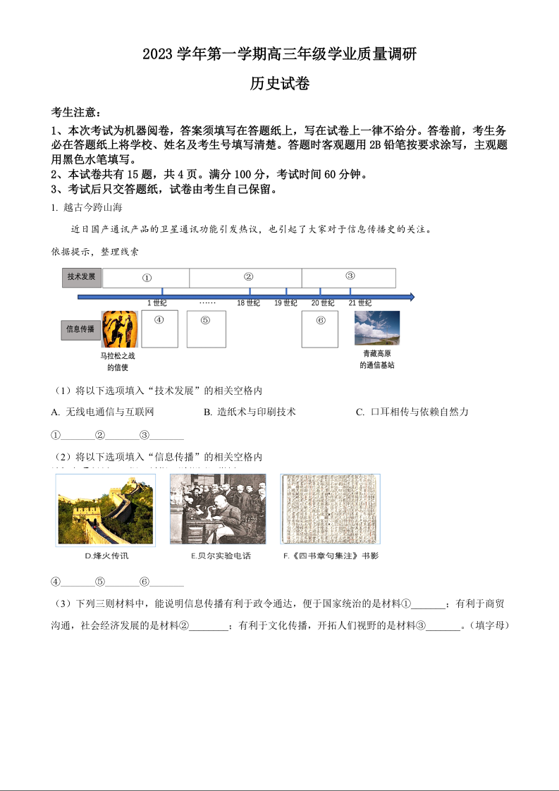 上海市闵行区2024届高三上学期学业质量调研试题(一模)历史+答案
