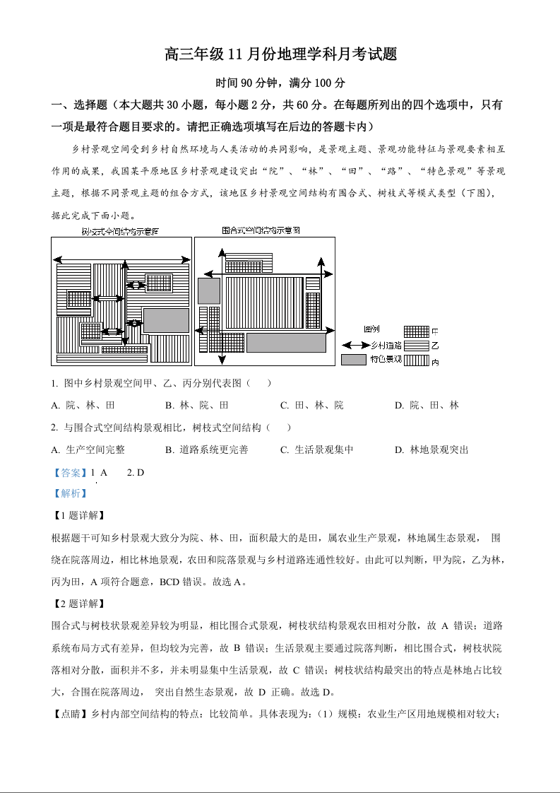山东省五莲县第一中学2024届高三上学期11月月考地理(精品解析版)