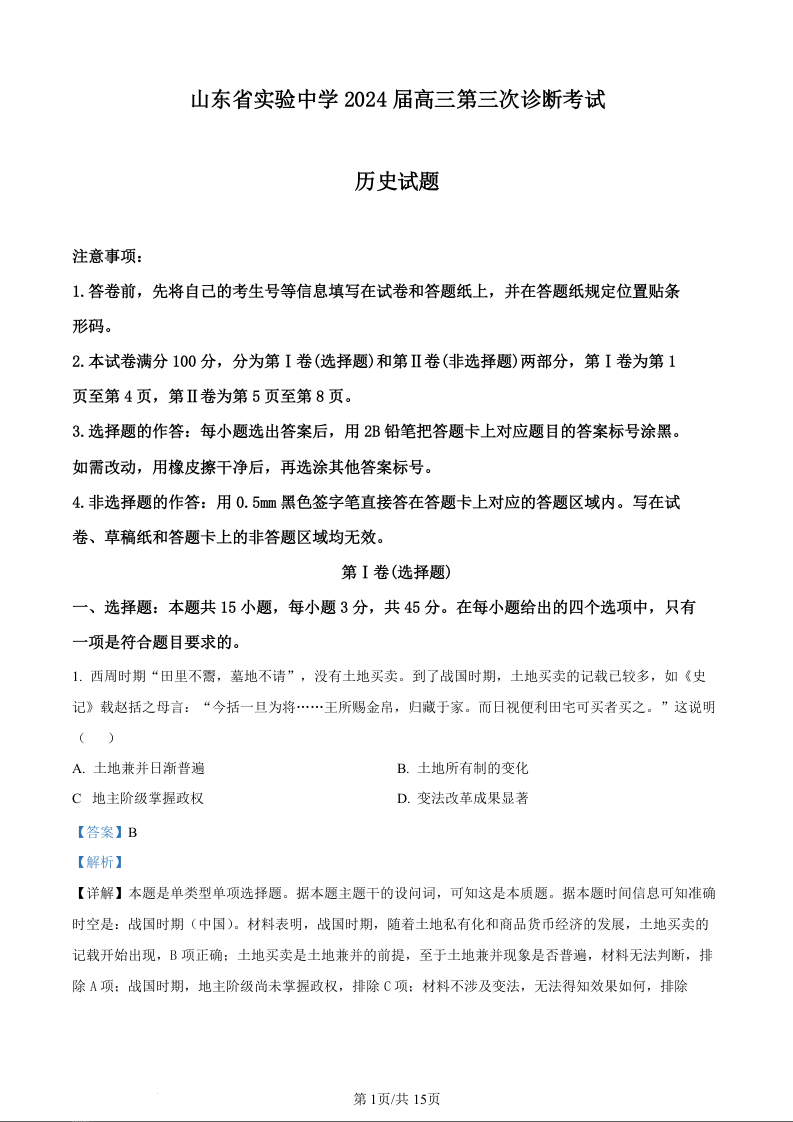 山东省实验中学2024届高三上学期第三次诊断考试(12月)历史(精品解析版)