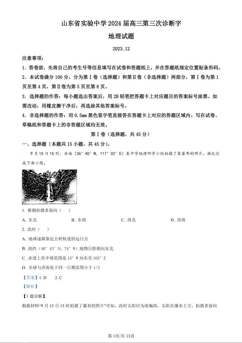 山东省实验中学2024届高三上学期第三次诊断考试(12月)地理(精品解析版)