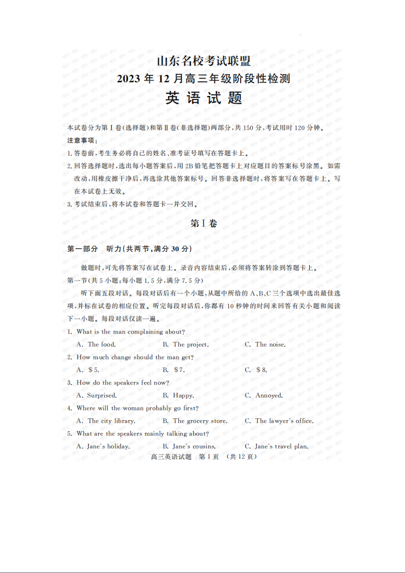 山东省名校联盟2024届高三上学期12月阶段性测试英语