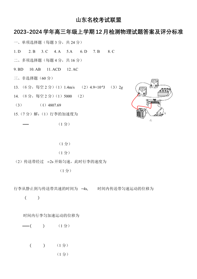 山东省名校联盟2024届高三上学期12月阶段性测试物理答案