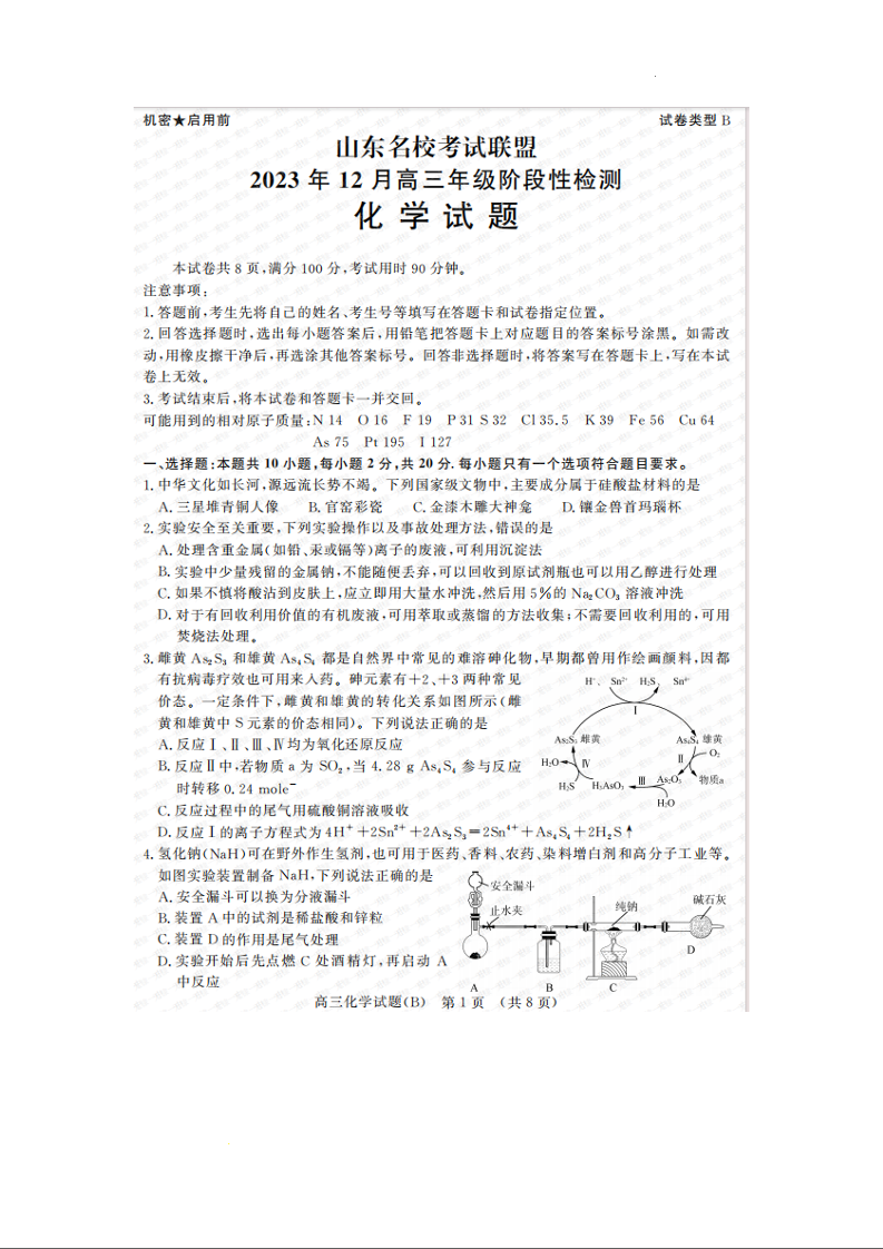 山东省名校联盟2024届高三上学期12月阶段性测试化学