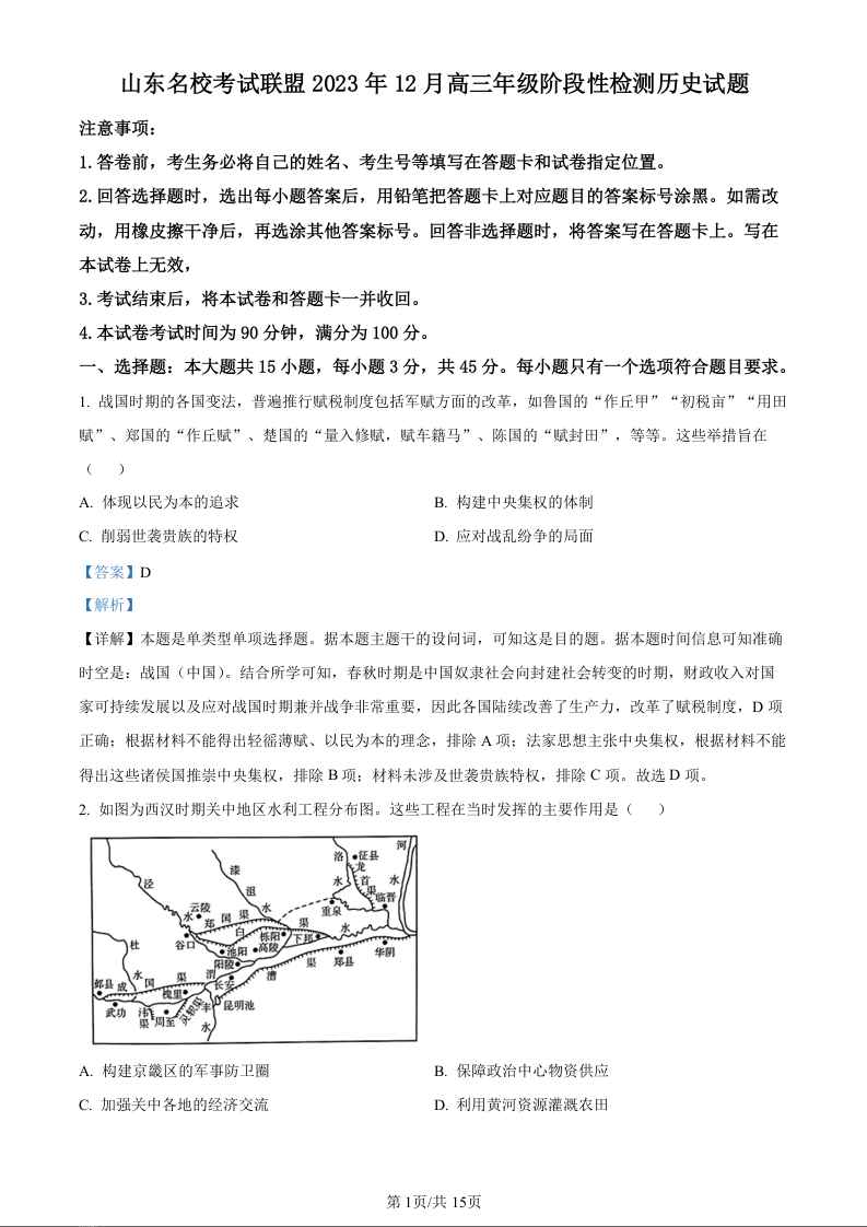 山东省名校联盟2024届高三上学期12月阶段性测试历史(精品解析版)